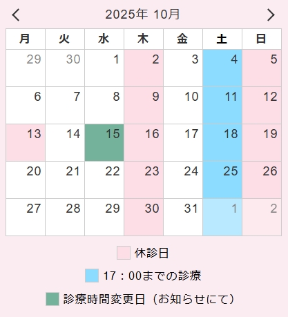 10/15(水)は17:00までの診療となります。
